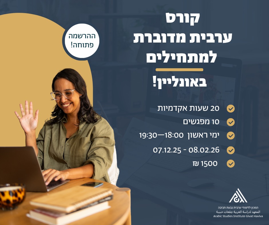 מרחבא בכם, اهلا وسهلا אנו שמחים ונרגשים לקראת פתיחת הקורס המקיף הקרוב : תאריכי הקורס – 18.1.26 עד 26.3.26. הקורס נלמד 5 ימים בשבוע – מראשון בצהריים עד חמישי בצהריים. מורי המכון אקדמאים, בעלי ותק ורובם דוברי ערבית שפת אם. בקורס לומדים שפה ותרבות ערבית על כל משלביה: ערבית דבורה וכתובה ברשתות חברתיות, בעיתונות, בתקשורת. הרצאות בערבית בתחומי תרבות, אסלאם ומזה"ת. במהלך הקורס, במידה ויתאפשר, יוצאים לסיורים לימודיים יומיים כדי להכיר מקרוב את האוכלוסייה הערבית בארץ: אורח חיים, תרבות ומסורת. פתיחת הקורס מותנית במינימום משתתפים.